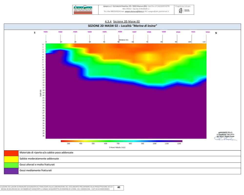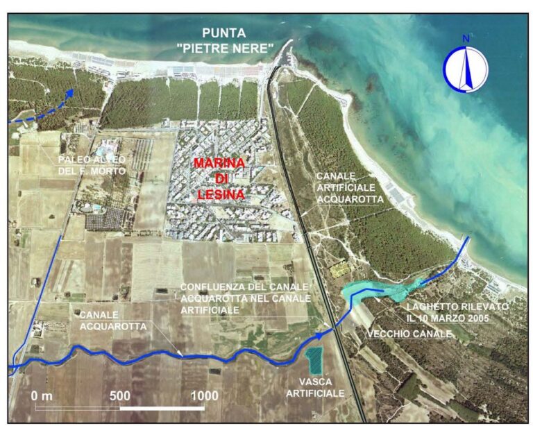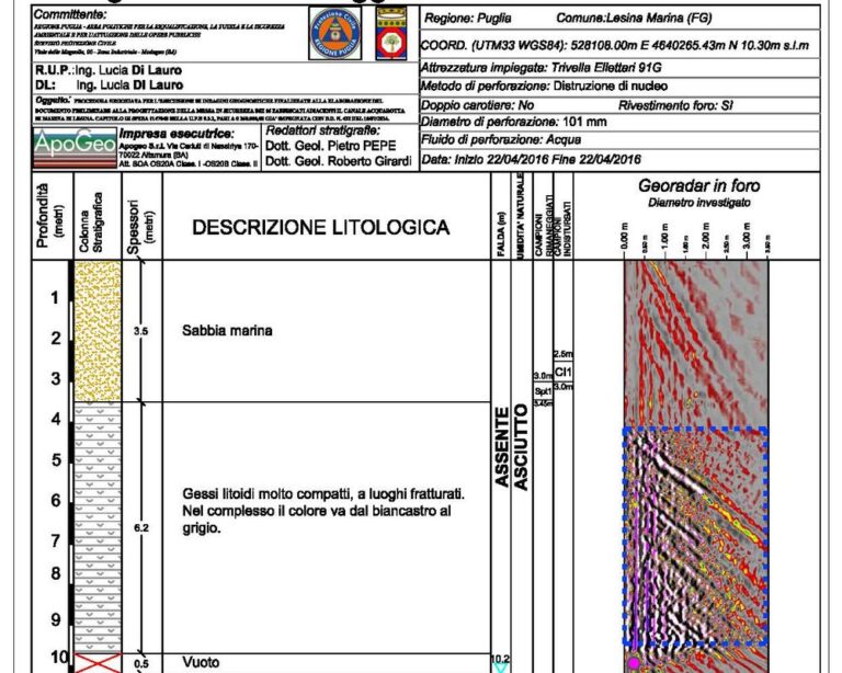 Nell’ambito dei lavori in oggetto è stata pianificata ed eseguita una campagna di indagini geognostiche di tipo diretto ed indiretto finalizzata all’ampliamento conoscitivo del quadro geologico e geotecnico del sottosuolo di marina di Lesina, nell’area adiacente il Canale Acquarotta. Tale area ha subito un importante dissesto causato dell’erosione nel banco di gessi costituente il sottosuolo che ha provocato la formazione di cavità, pertanto, tutta l’area è stata classificata ad Alta Pericolosità Geomorfologica (PG3), secondo il Piano di Assetto Idrogeomorfologico (PAI) dell’Autorità di Bacino della Puglia.