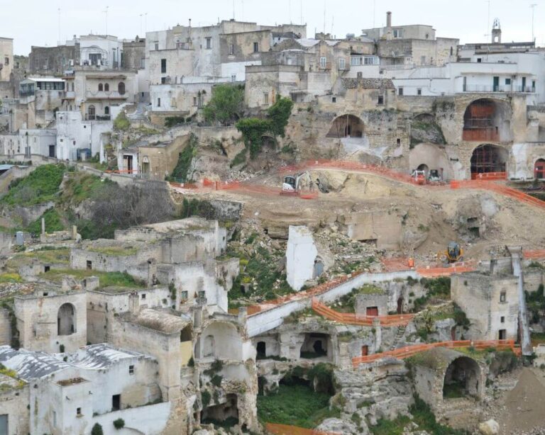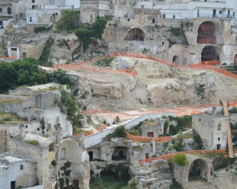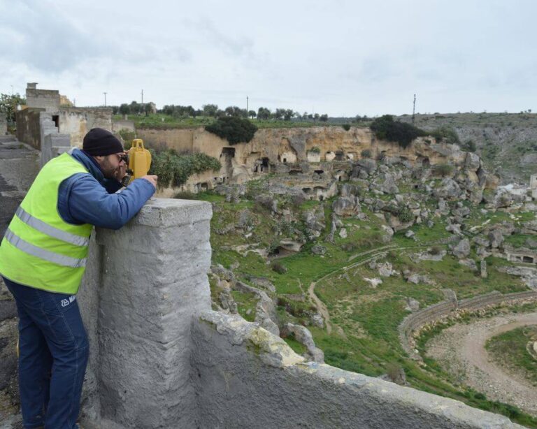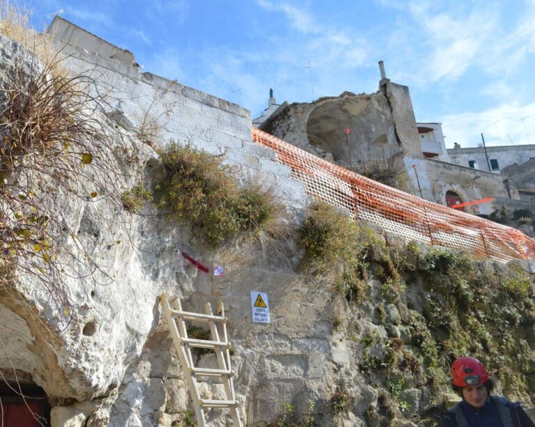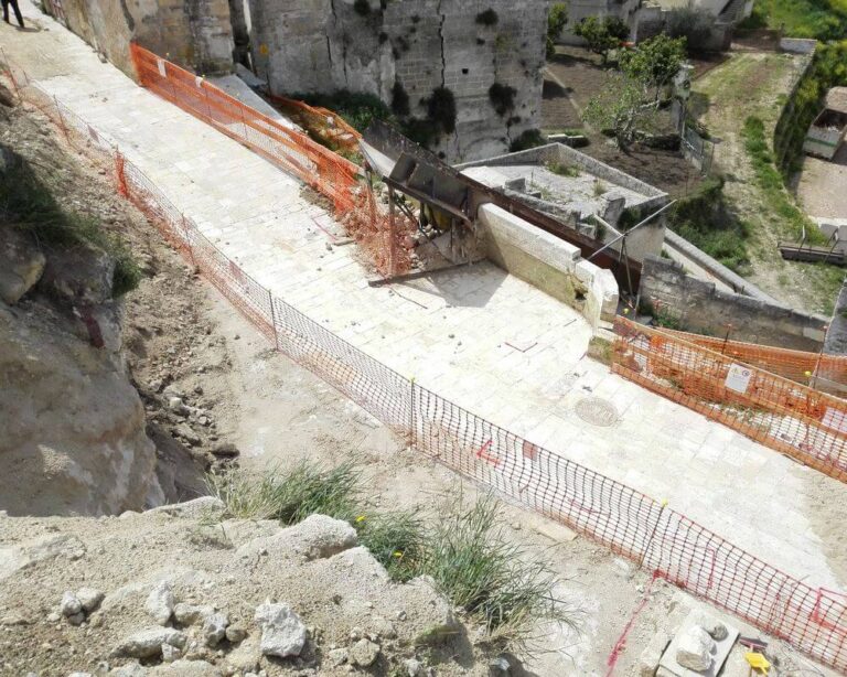 L’intervento di progettazione e lavori ha interessato un’area nel centro storico di Ginosa, a ridosso della Gravina, in cui è avvenuto il crollo di una porzione di Via Matrice il 21 gennaio 2014, su cui insisteva una abitazione privata. Il versante interessato dal crollo, orientato circa NW-SE, è molto antropizzato e si caratterizza per la sovrapposizione di più ordini di antiche cavità ipogee di origine antropica e di abitazioni di più recente costruzione. La presenza di queste cavità, che si approfondiscono nel substrato calcarenitico anche per decine di metri, costituisce un potenziale elemento di instabilità e di innesco di fenomeni di crollo. Lo studio geologico è consistito in una prima fase di ricognizione dei luoghi e ricerca della cartografia tecnica e vincolistica vigente, soprattutto in relazione alle aree classificate a rischio dall’AdB Basilicata.